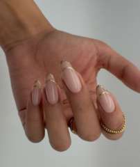 باستخدام فرشاة رفيعة وطلاء أظافر باللون الأسود، قومي برسم أشكال بسيطة، مثل مثلثات صغيرة على الحواف أو رموز مستوحاة من الهيروغليفية. يمكن أيضاً إضافة خطوط دقيقة حول حواف الأظافر لتعزيز التصميم.
